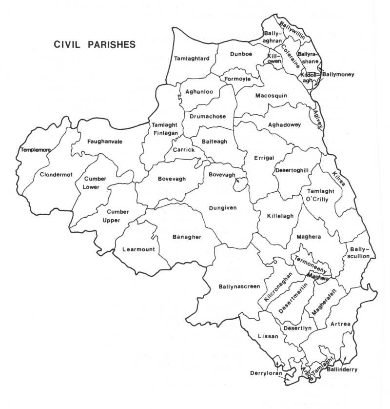 Many record sources of value, both civil and church, to family historians were compiled and recorded by parish. By mid-19th century, County Derry was subdivided into 46 civil parishes. Realistic genealogical research, in the absence of indexes and databases, generally requires knowledge of the parish in which your ancestor lived.
